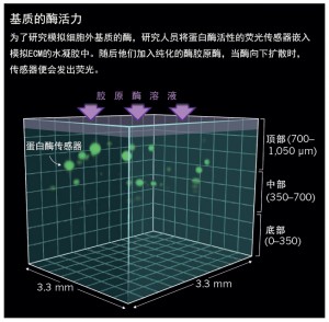 Leight设计了一种基于MMP切割的胶原蛋白序列的肽感受器。当被切割时,该感受器会发出荧光信号。通过把这种感受器整合到水凝胶中,便能够记录MMP酶的活性(图“基质的活力”)。